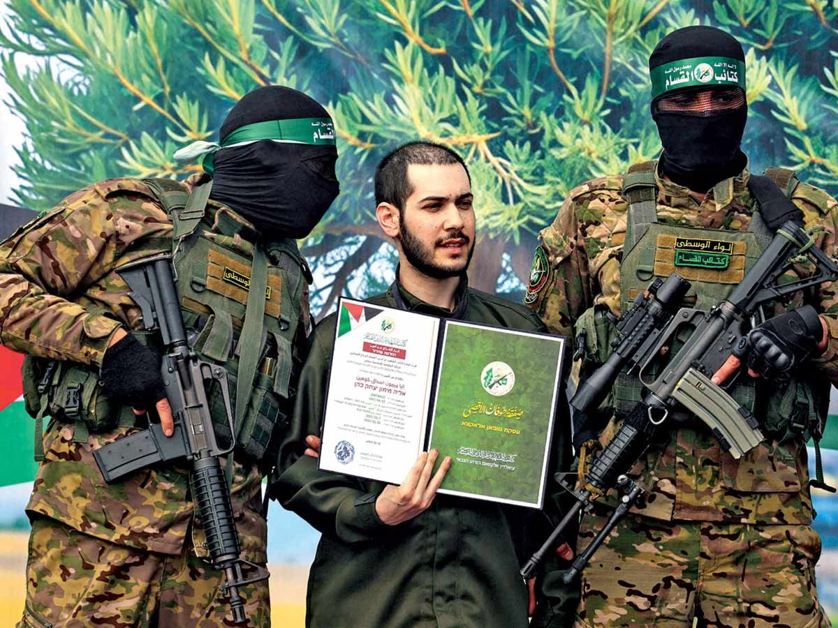 Durante la entrega de rehenes, miembros armados de Hamás los presentaron en una tarima antes de ser trasladados por la Cruz Roja.