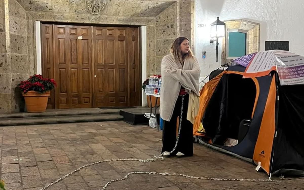 Una mujer identificada como Lisi Celis inició una protesta extrema frente a Casa Jalisco, sede del Poder Ejecutivo estatal, acusando a las autoridades de violencia institucional y protección de la violencia vicaria después de años de litigio por la custodia de sus hijos.